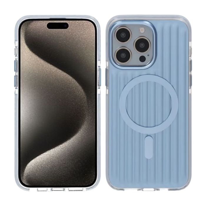 Den korrugerade baksidan i blå ger både unikt utseende och förbättrat grepp, samtidigt som MagSafe-kompatibilitet gör trådlös laddning smidig och stabil.