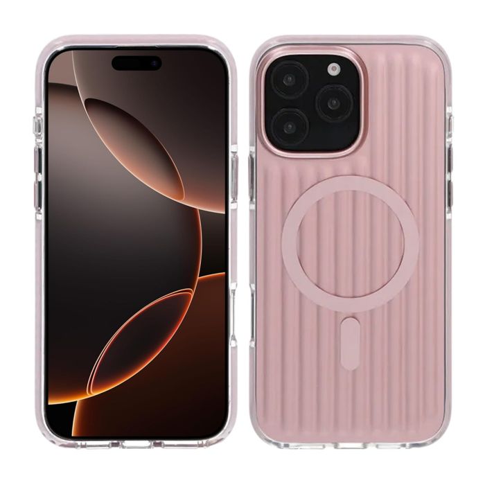 Den korrugerade baksidan i rosa ger både unikt utseende och förbättrat grepp, samtidigt som MagSafe-kompatibilitet gör trådlös laddning smidig och stabil.