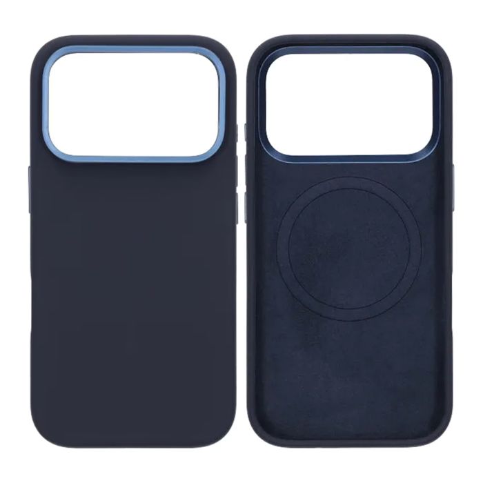 Ett slimmat, stötdämpande silikonskal i blå färg som kombinerar ett praktiskt magsafe skal med ett smart kameraskydd.