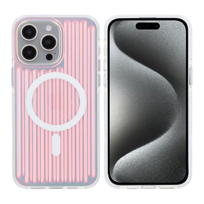 Ge din iPhone 15 Pro Max en unik look med detta stöttåliga mobilskal som har en reflekterande iriserande finish med ett inslag av röd färg.