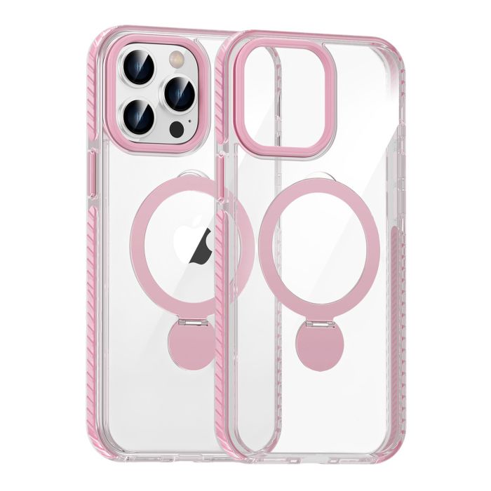 Ge din iPhone 15 Pro både stil och smart funktion med detta transparenta och rosa MagSafe-skal utrustat med en utfällbar ring som snabbt blir ett praktiskt stöd i vardagen.