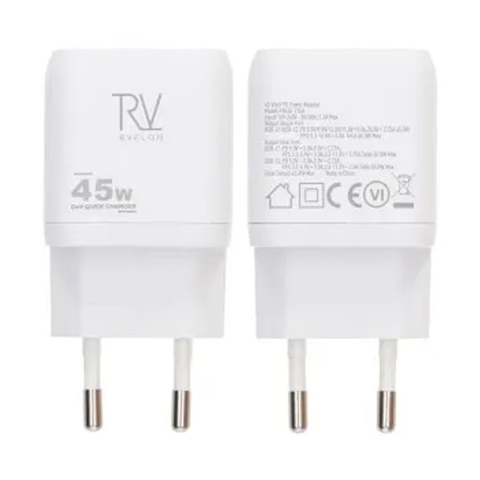Rvelon presenterar en kompakt och kraftfull 45W GaN-väggladdare med två USB-C-portar som är designad för snabb och effektiv laddning av alla dina enheter.