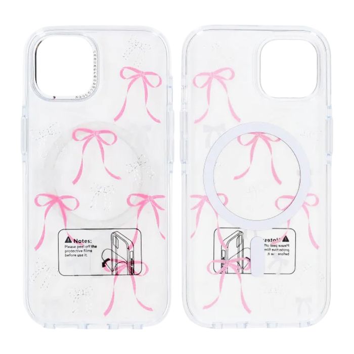 Ge din iPhone 15 en personlig touch med detta transparenta mobilskal med rosa rosetter.