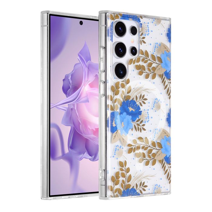 Samsung Galaxy S24 Ultra Mobilskal Magnet - Blommor Blå/Guld
